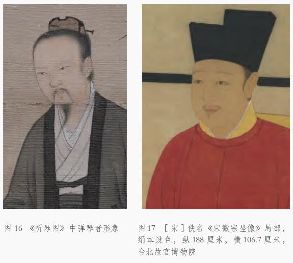 《听琴图》中弹琴者头上所戴的,既非帝王祭服中的冕冠、朝服中的通天冠,也非道教法衣中的玉清宝冠之类,而是闲居时穿戴的“小冠”。依宋代服制,上至帝王,下至诸臣百官,除了祭祀典礼、大朝会等隆重场合按礼服形制戴冠冕以外,其余场合一律戴幞头。而在“谒见士大夫并行科升章”等较为正式的场合,“则簪冠而彻巾穿舄,是三代之制,尚于羽士见之”。这说明小冠是比幞头稍更正式的穿戴,而且是“三代之制”。宋人叶梦得也以亲历者角度确认了小冠佩戴的场合:“余见大父时家居及燕见宾客,率多顶帽而系勒帛,犹未甚服背子。帽下戴小冠簪,以帛作横幅约发……处室中,则去帽见冠簪,或用头巾也”。而宋帝的小冠,除了闲居时的使用,还兼有继承祖制的意义:
