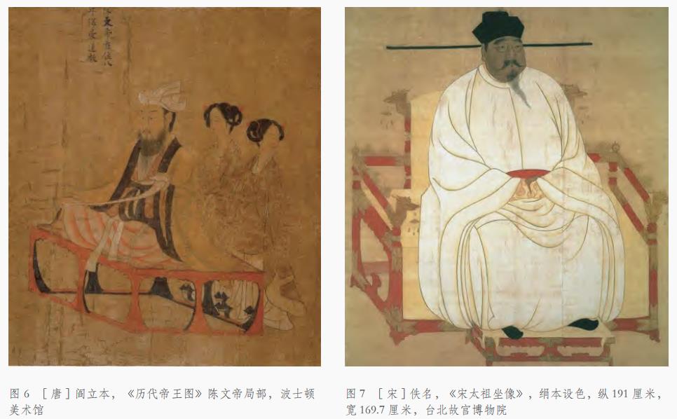 商周时期没有帝王像的传统,也没有类似于圣经传统中的那种偶像崇拜或反偶像崇拜。至汉代,在现存的考古材料中出现了历代帝王像,其中最典型的例子莫过于山东嘉祥武梁祠中的古代帝王像。作为礼仪性质的图像,帝王常作宽袍大袖造型,手部无从可见,魏晋南北朝时传为东晋顾恺之《女史箴图》中的汉成帝、北魏司马金龙墓漆画屏风中的帝王、洛阳龙门宾阳洞的皇帝礼佛图、巩县石窟第一窟南壁的帝后礼佛图等均是如此。《历代帝王图》上的十三位帝王中,有五位的手部得以呈现,分别为吴主孙权、前汉昭帝、陈文帝(图6)、陈废帝、隋文帝,他们的手都有共同的特点,即短且肥,并绘有指节和指甲。如果考虑到图像的功能和应用范围,画像石等图像似乎显示了“帝指不可示外人”的禁忌。而《历代帝王图》更多是用于内廷供奉,作为鉴戒之用,对于内廷的观看者“内人”而言,似乎可以无此禁忌,但对手的描绘与《听琴图》相比显然不是一个类型。