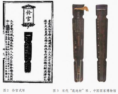 两位琴待诏都做倾耳聆听状,把观众的视线引向弹琴者和所弹之琴。弹琴者右手的食指作挑弦之势,左手用大指按弦,似方作进退吟揉之状。此琴为“伶官式”,在现存最早的琴谱、明代永乐十一年编纂而成的《太音大全集》中载有三十八种琴式的图像及说明文字,其中就有“伶官式”琴(图2)。今天流传下来的伶官式古琴有中国国家博物馆藏的宋“混沌材”琴(图3),其琴式从头到尾均与历代琴谱中“伶官式”一致。根据郑珉中的研究,此琴为“野斫”琴,由徽宗朝琴人所制。琴上的十三个琴徽清晰可辨。琴徽的起源有汉代说和魏晋说两种,古琴徽位经历了“无徽位”,到“暗徽”,再到“明徽”的演变,最终形成现行古琴的“十三徽”。但至少在魏晋之后,十三琴徽制已经固定下来。
