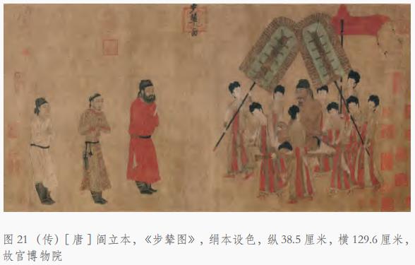 这种现象已有先例。《步辇图》(图21)中,并没有呈现盛大的接见番邦使者场面,而只是通过描绘少数几人来表现这个重大事件。唐太宗身着便服、乘辇见蕃臣,表明地点在后(寝)宫或是家庙之中,有学者认为这表明唐太宗把此当是家事。但画中将宫殿背景虚化,使图画看起来更为紧凑和完整。