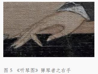 基于以上的背景,我们无法不注意《听琴图》中的弹琴之手(图5)。这双手细长、柔婉,如果再进一步观察细节,可发现甚至描绘了指节和较长的指甲,且指甲露出指端。这种“帝指”的描绘方式把我们的视线引向对历代图像史中的帝王之指的观察。