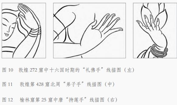 超长的指甲在历代绘画中并不多见。指甲露出指端,以及指甲退入指端是常见两种描绘方式。敦煌壁画中,最早可见的是退入手指的指甲,如莫高窟第435窟北魏“持花手”,这种指甲是敦煌壁画中的常见现象。较早描绘指甲微露出手指的,是第428窟北周“弟子手”(图11),第220窟初唐“持扇手”中,一只手中同时描绘有露出和退入的指甲,这也是敦煌壁画中唯一的一例,反映了人们已经意识到这两种不同的形态。值得注意的是,这只手还描绘有饱满的指节,跟之前没有表现指节的手指有明显差异。此外,还可发现几例中唐时期的敦煌壁画中绘有指节、露出的指甲,如榆林窟第25窟中唐“菩萨手”和“持莲手”(图12)。也就是说,对于指节和露出指甲的描绘,是北周开始出现,中唐以后渐次增多。