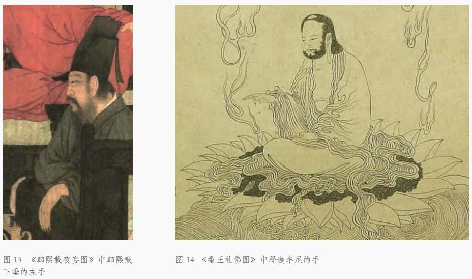 面对宋画,如果我们的目光不止聚焦于“弹琴之手”,而是别的人物手指,便能发现长的手指并非不能见到。《韩熙载夜宴图》“清吹”部分中,几位手持笛、箫的仕女的手部都柔婉细长、指甲明显,显得优雅灵巧,似乎是为了凸显其演奏的高超技巧。在起首部分,我们惊讶地发现,韩熙载下垂的左手超乎寻常的长,与手掌和整个人体的比例不称,且没有表现指节(图13)。然而奇怪的是,另外三位韩熙载的手,其手指、手掌的比例均在正常范围之内。如果考虑到这件作品为南宋中晚期摹本,其中混杂有从五代顾闳中到南宋中晚期的信息,那么不妨设想,这两种不同的手可能分属于不同的时期。或者说,某些信息在反复临摹复制的过程中经过改易,而其中较容易被改动的,显然是那一只唯一的长手。其如此的不合比例,可能正是在历次临摹过程中逐渐被加长的结果,那么,它不仅反映了南宋中晚期的信息,也显示了对前代的传承。