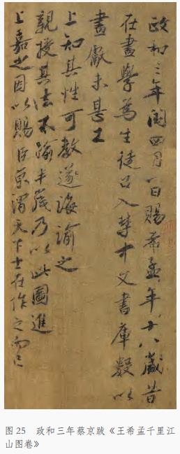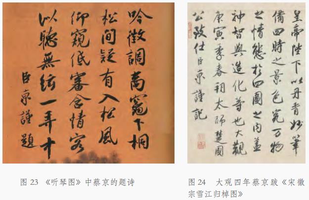 对于《听琴图》上蔡京题字的落笔时间有多种不同的看法。蔡京书法先学于本朝蔡襄,再学唐代徐浩,又学沈传师。近五十岁时又开始学欧阳询,后又学王羲之与王献之父子。其稍早作品《节夫帖》可看出与米芾书法的相合之处,中宫紧促、字形跳荡、节奏明快、点画挺劲率意。大观四年跋宋徽宗《雪江归棹图》(图24)大概是应徽宗之命题跋的缘故,