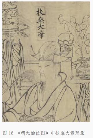 在《朝元仙仗图》中,我们可以发现扶桑大帝的形象(图18)。其面部与《听琴图》有颇多相似之处,尤其是嘴唇和口鼻联合处的造型,此外其狭长的眼部形状,以及冷漠高古的眼神与《听琴图》中的几乎毫无二致。《八十七神仙卷》中,与扶桑大帝同样位置的图像基本相似。吴秋野认为《朝元仙仗图》与《八十七神仙卷》所反映的是早期全真教神系图。《朝元仙仗图》的绘制应在金宋时代,代表了全真教北方绘画的普遍风格。其上有南宋乾道八年(1172)张子□的题跋,如果它是摹本,则原作的绘制年代也应该就在此之前。李凇推测现存归于武宗元名下的《朝元图》原本就是南宋翟汝文自己执笔之作而不是他的藏品,其母本可能来自武宗元,或是其摹本。而《八十七神仙图卷》当作于北宋初期,可能为宋初著名画家王瓘,或北宋前期画家武宗元所作。吴秋野认为这两件作品都反映了世代传授于民间的宗教人物画画法,把其作者归于名家名下,以为是文人画家如赵孟頫归化的结果。