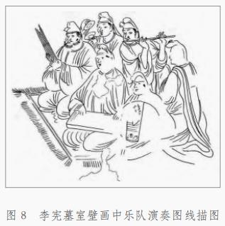 绘画史中对于手、以及对抚琴之手的描绘,有个逐渐准确和细致的过程。从汉代到魏晋南北朝时期,从各种材质的图像中,我们不难发现这个演进。唐代墓室壁画中的弹琴之手,显示了这种演进的延续。让皇帝李宪墓室东壁南部描绘了一组乐队,其中一位乐工正演奏瑶琴,虽然对手指表现并不明显,但比例符合人体正常尺寸,力求表现现实生活中的演奏场景(图8)。同时,1952年在西安东郊兴庆宫遗址附近出土的唐天宝四年苏思勖墓中,描绘有弹奏七弦琴的场景,乐工将七弦琴放在腿上,左手按住琴弦,右手做拨弄状。人物形象简单概括,线条简练。手指并没有精细描绘指节与指甲,却也显得柔软修长,整个手掌、手指合乎正常比例。可见所绘是世俗生活的再现,故而力求呈现现实的手。宋画中也不乏弹琴的图像,佚名所作的《卢鸿草堂十志图》描绘了一个临流弹琴的文人,画作似乎更在意对整体氛围的描绘,而对弹奏动作和手部并未着力。佚名《九歌图》中“云中君”乐队里,一男性正在演奏古琴,依琴弦似为八弦琴。演奏者左手按在琴弦上,右手正在弹奏,手指偏长,指甲可见。但与《听琴图》中手指长度相比,尚有距离。且该图具有“南宋院画特征”,无法用于论证《听琴图》手指图式的来源,或可理解为这种稍长手指和指甲是对北宋或更早传统的继承。