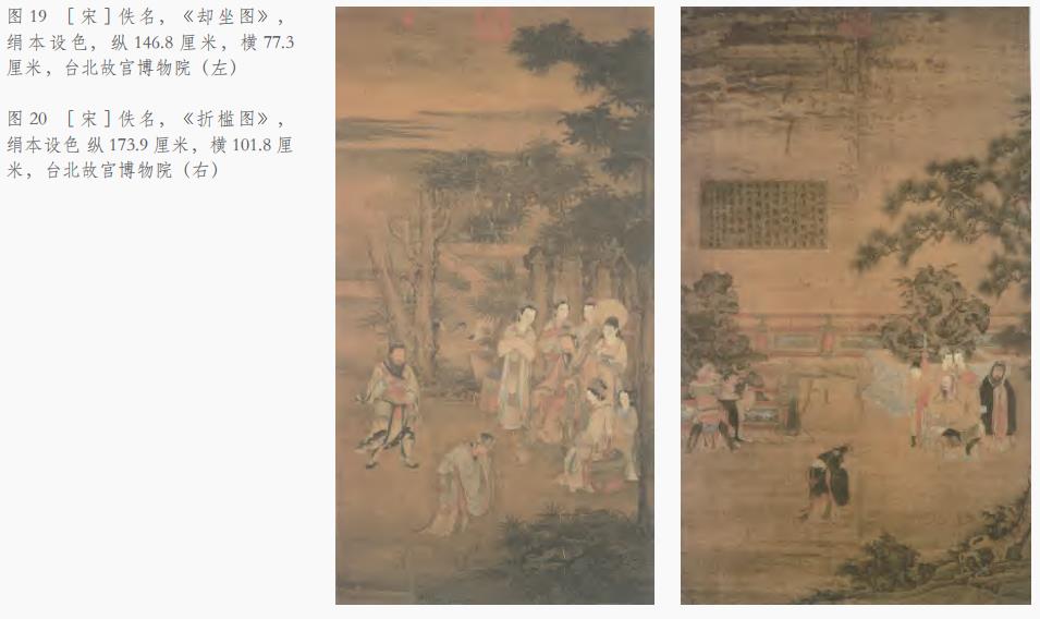 上述几张规鉴图均呈现三角形的构图,但其中的冲突氛围和权力关系并不一致。《锁谏图》描绘前赵廷尉陈元达为营造宫殿事谏其主刘聪,虽然画面中描绘有为之说情的皇后刘氏、匍匐在地的大臣两人,但冲突主要在两人之间,并以对角线式的构图展示这种冲突。《却坐图》(图19)是西汉袁盎因慎夫人与皇后同席,而向文帝进谏的故事,虽有慎夫人在场,但冲突主要在文帝和袁盎之间,旁边的武士是皇帝威权的延伸,增加了这种威压的冲突氛围,使得这种三角形构图呈现二比一向右下角倾斜的态势。《折槛图》(图20)虽然也是三角形构图,但冲突主要表现在汉成帝和大臣朱云之间,两人呈横向对角线关系,左将军辛庆忌的求情缓解了这种紧张氛围,也使三角形构图之间的张力得以消解。王正华指出《听琴图》中三位主要人物与奇石台座几乎呈十字形四角对应,显示传统的帝王的位阶秩序。但我们更应注意到人物之间的三角形构图,其三角构图关系比较稳定,绿、绯衣者共同承受来自弹琴者“听”的指令,虽然他们之间存在潜在的权力转换,但整体上对于帝王威权的接受是稳定的。前三图均通过画面的强烈冲突表明对帝王纳谏的规鉴,而《听琴图》用较为和缓的方式引导臣子对“听”的重视,以及基于此角度的对君臣和谐关系的规鉴。因此,我们不难发现,《听琴图》在规鉴图式流变过程中的意义。