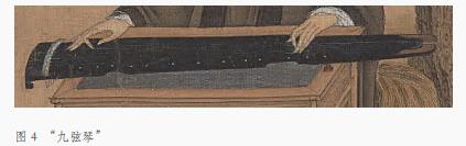 故宫博物院“林下风雅——故宫博物院藏历代人物画特展(第二期)”展出期间,笔者多次往文华殿展厅观察此图,经反复谛视,发现琴弦并非七根,在弹琴者右手指尖,可清晰发现另有两根琴弦,故而总共应有九根琴弦(图4),只是左手琴尾处,似为七根琴弦。九弦琴在文献中甚少出现,《古今注》称:“后汉蔡邕益琴为九弦,后还用七弦”。有学者认为《古今注》类似小说家言,又没有其他较为可靠的旁证,所以只能暂时存疑。还有学者将1980年湖南长沙五里牌战国楚墓出土的那一件“暂名”为“九弦琴”,这一说法值得商榷:音乐考古学家李纯一早就指出过,这张古琴的龙龈和雁足上有弦勒痕迹,所以是实用乐器。但从龙龈上九道不明显的弦痕来看,它有可能为九弦,也有可能略多或略少于九弦。因五里牌楚墓出土古琴的弦数目前还不能确定,所以北宋之前是否真的出现过九弦琴,还有待进一步考证。