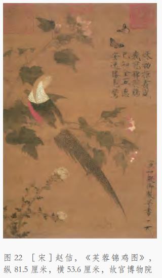 值得注意的是,《芙蓉锦鸡图》《腊梅山禽图》上题字中都有“宣和殿御制并书”(图22)字样,这也给我们判断这类风格作品的时间提供了线索。宣和殿建成于北宋哲宗绍圣二年四月,为哲宗“燕处”之所,元符三年被毁拆。徽宗大观二年又重新起建,徽宗亲书并勒石纪念,宣和二年,宣和殿改名为保和殿。因而,有“宣和殿”落款的这批作品下限为宣和二年之前。
