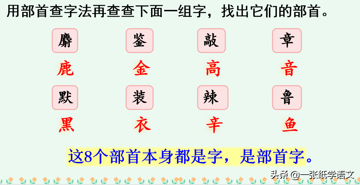 。部首字不止这些,但是期末考查范围不会超出这8个字。能记住小儿歌还不会具体运用的,需要提问一下这些部首的字都有哪些?如麝、鉴、敲、章、默、装、辣、鲁,还可以翻开字典,查看一下部首下面有哪些字,扩展部首字的记忆。