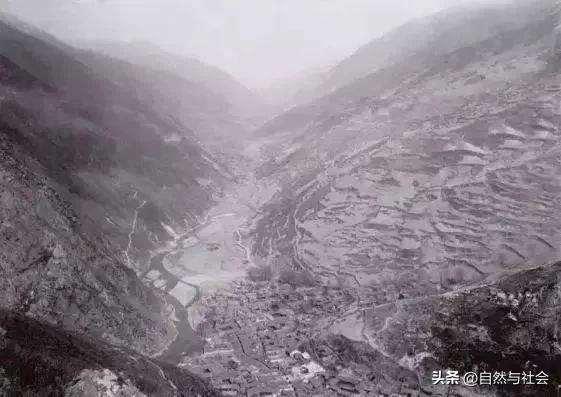 叠溪大地震四周山峰崩塌,堆积体阻塞岷江,形成堰塞湖(庄学本摄于1934年)