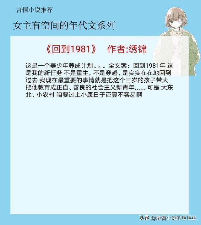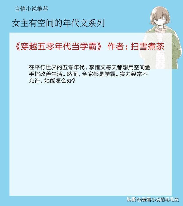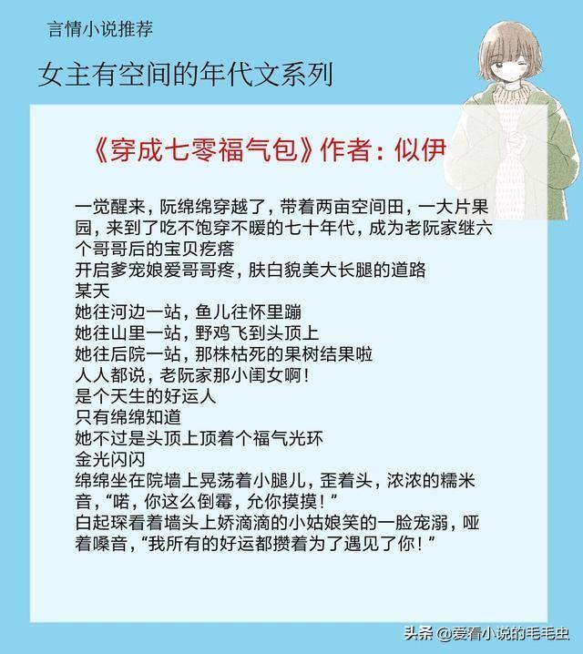 但是现实仍然让她走上了努力学习、自己动手的学霸之路。本文生活气息浓厚,吃吃喝喝特别开心,情节出人意料又在情理之中,金手指使用不多但是用起来非常爽,绝对值得一读。5本女主有空间的年代宠文,男女主感情羡煞旁人,一辈子恩恩爱爱