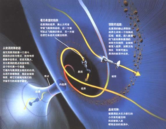 白洞其实就是黑洞的反演,而黑洞与白洞之间有三维以上的一个通道,从黑洞里面进去,从白洞里面出来,因为这些物质从黑洞那边被吸进去时有很大的速度,所以从白洞里喷发出来也有很大的速度,但是他们的速度一般相等。黑洞作为事物的一个发展终极,必然引致另一个终极,就是白洞。其实膨胀的大爆发宇宙论中,早就碰到了原初火球的奇点问题,这个问题其实一直困扰着科学家们。这个奇点的最大质量与密度和黑洞的奇点是相似的,但他们的活动机制却恰恰相反。高能量超密物质的发现,显示黑洞存在的可能,自然也显示白洞存在的可能。如果宇宙物质按不同的路径和时间走到终极,那么也可能按不同的时间和路径从原始出发,亦即在大爆发之初的大白洞发生后,仍可能出现小爆发小白洞。而且,流入黑洞的物质命运究竟如何呢?是永远累积在无穷小的奇点中,直到宇宙毁灭,还是在另一个宇宙涌出呢?