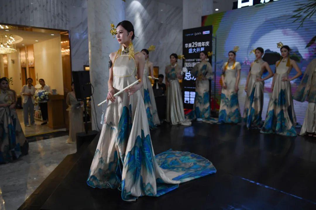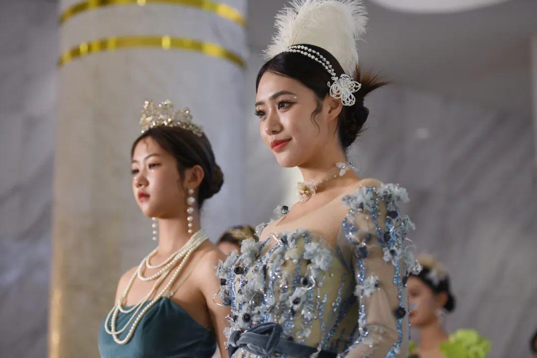 第二轮主题秀主题是“千里江山”,在舞台的灯光映照下,12位佳丽身着以青绿山水为主的古装,从容而优雅,如梦幻中的仙子般缓步走上舞台,仿佛带着观众穿越到了神秘的古代世界,将古代的风韵演绎得淋漓尽致。伴随着轻盈的音乐,模特们交错而行,如诗如画。观众们仿佛被带入了一个充满奇幻和浪漫的世界,流连忘返。图为佳丽在进行第二轮走秀。