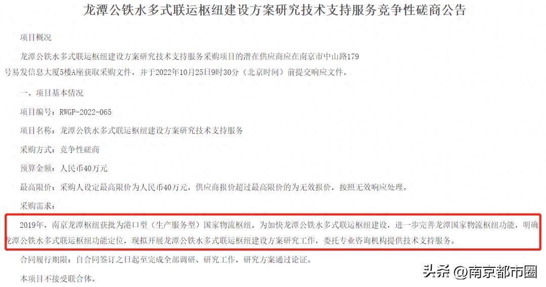 公告显示,南京龙潭枢纽为港口型(生产服务型)国家物流枢纽,对于这样的定位,需要展开相关方案研究工作。