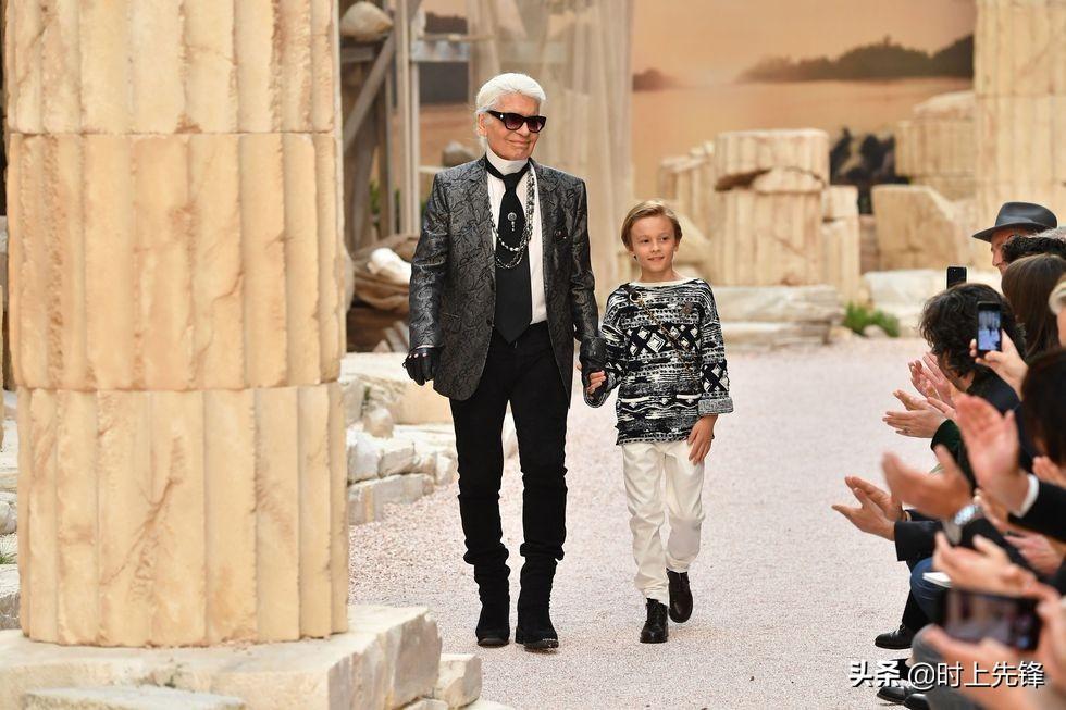 老佛爷Karl带着身穿白色西装,脚踩银色休闲鞋的9岁Hudson,现身Chanel2018 秋冬时装秀的终场致意。