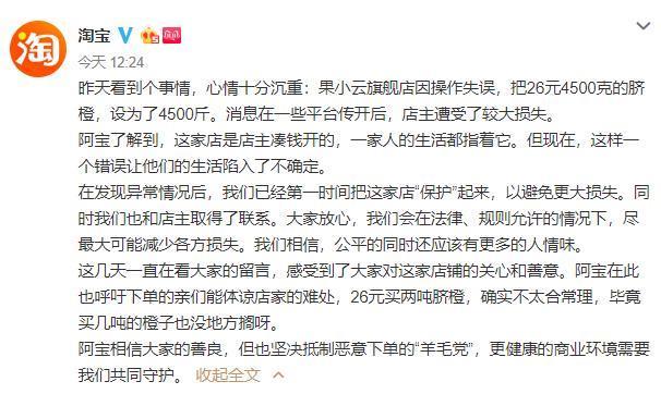 近日,一淘宝店家因操作失误,误将26元4500克的脐橙写成了4500斤后,B站博主“路人A-”号召粉丝去“薅羊毛”,又在商家无法发货的情况下,恶意投诉“商家虚假宣传”,导致该店铺直接关店。