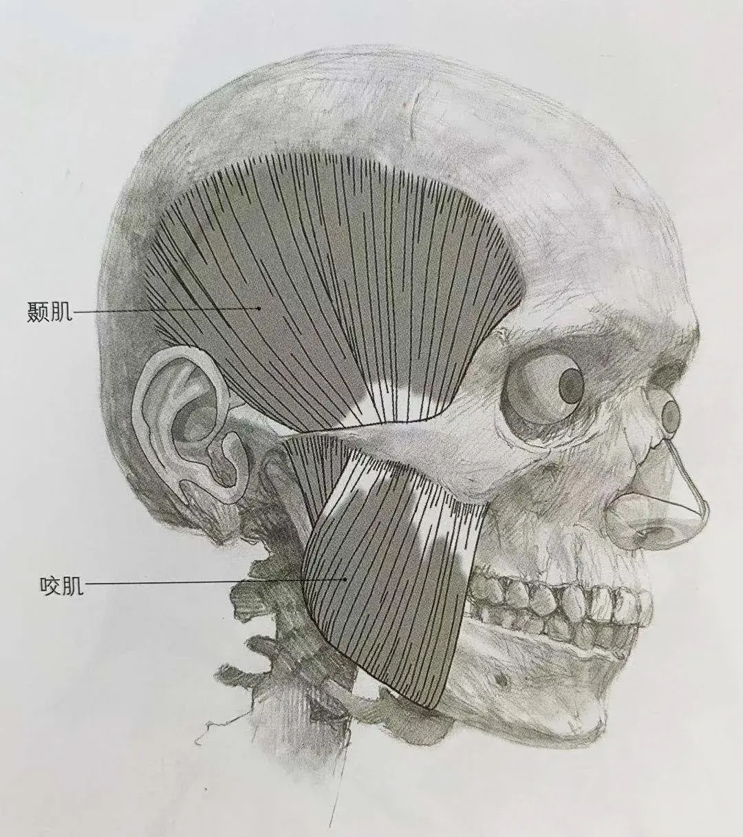 在头部的某些区域,其外部形态是由肌肉而并非骨骼决定的。颞肌辅助构成头部侧面的形态,而咬肌以及提肌在较小程度上构成颧骨以下的面部形态。