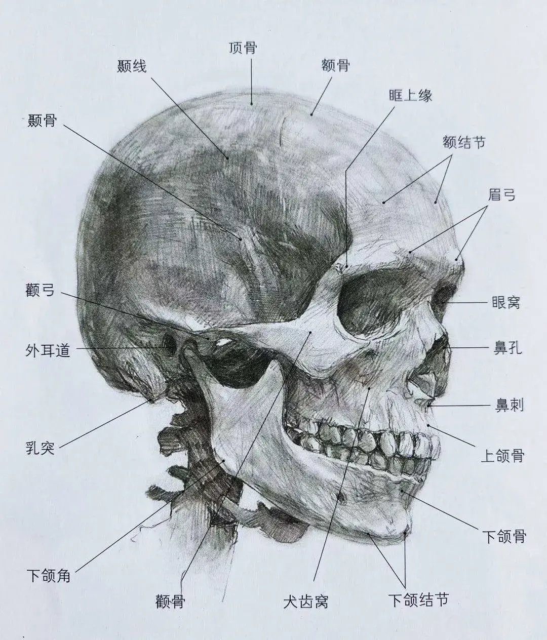 作为骨骼结构,头颅在很大程度上决定头部和面部的外在特征。就画家而言,对颅骨的学习比骨骼中任何其他部分都重要。