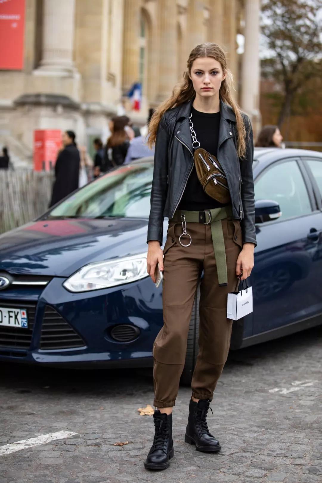 当然在工装裤的选择上,不要选择常见的直筒版型,而是选择有束腿设计的裤脚,这样子,可以露出马丁靴的全样,也可以让整个人的穿搭看上去又高又瘦。