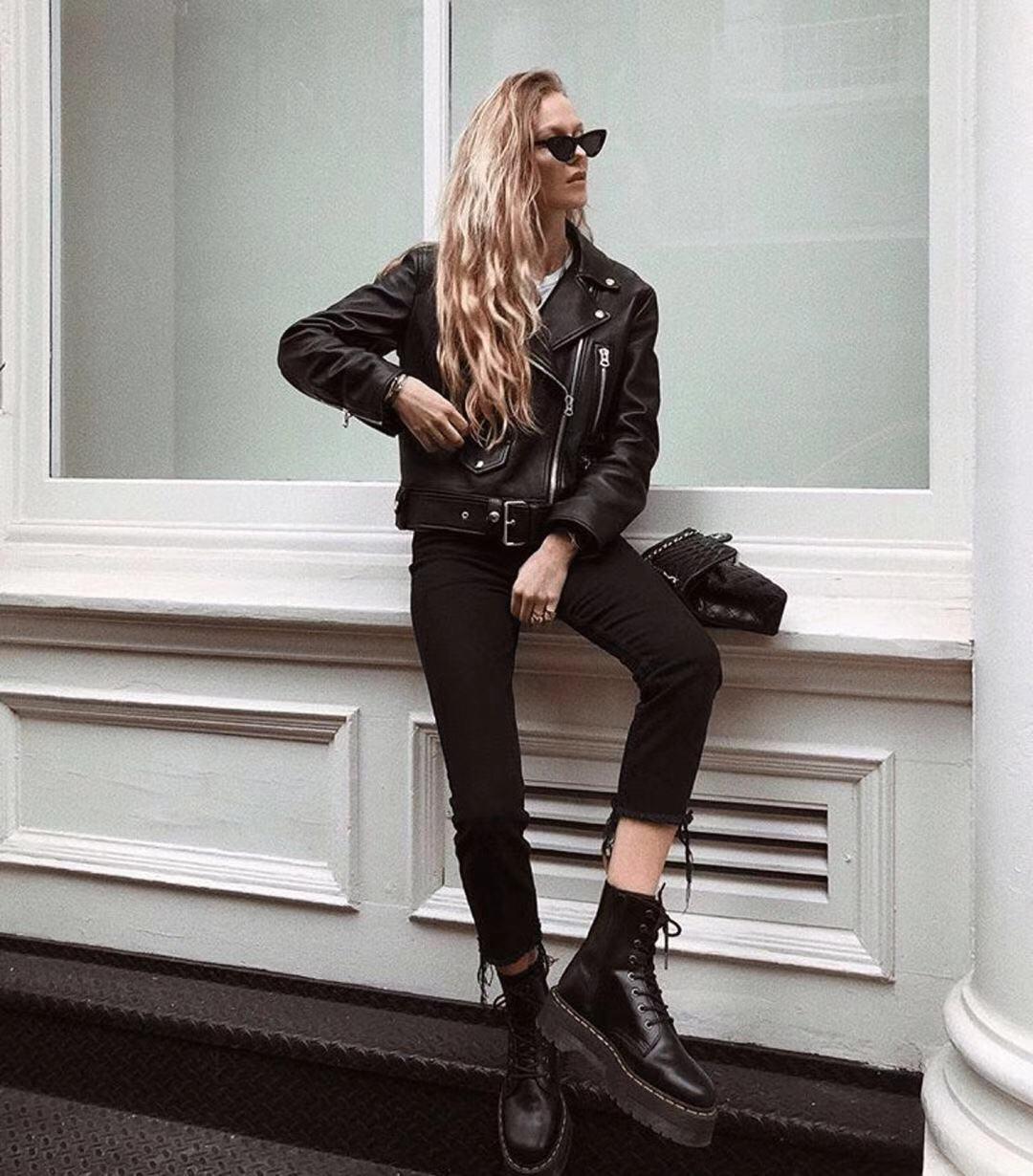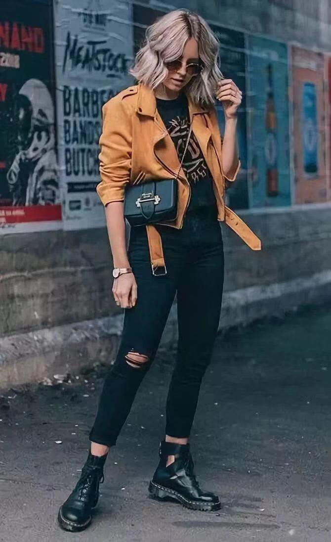 对于腿部线条好看的女生,这个穿搭一定要学起来。修身的小黑裤自带显瘦显高的效果,再配合马丁靴,让你帅气的气场增加十倍。