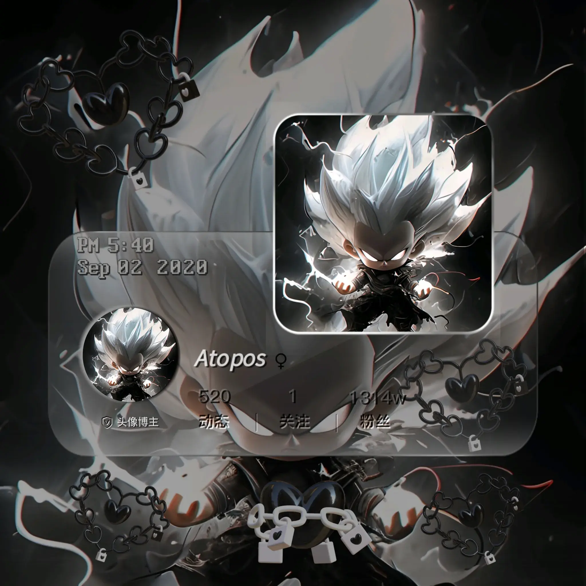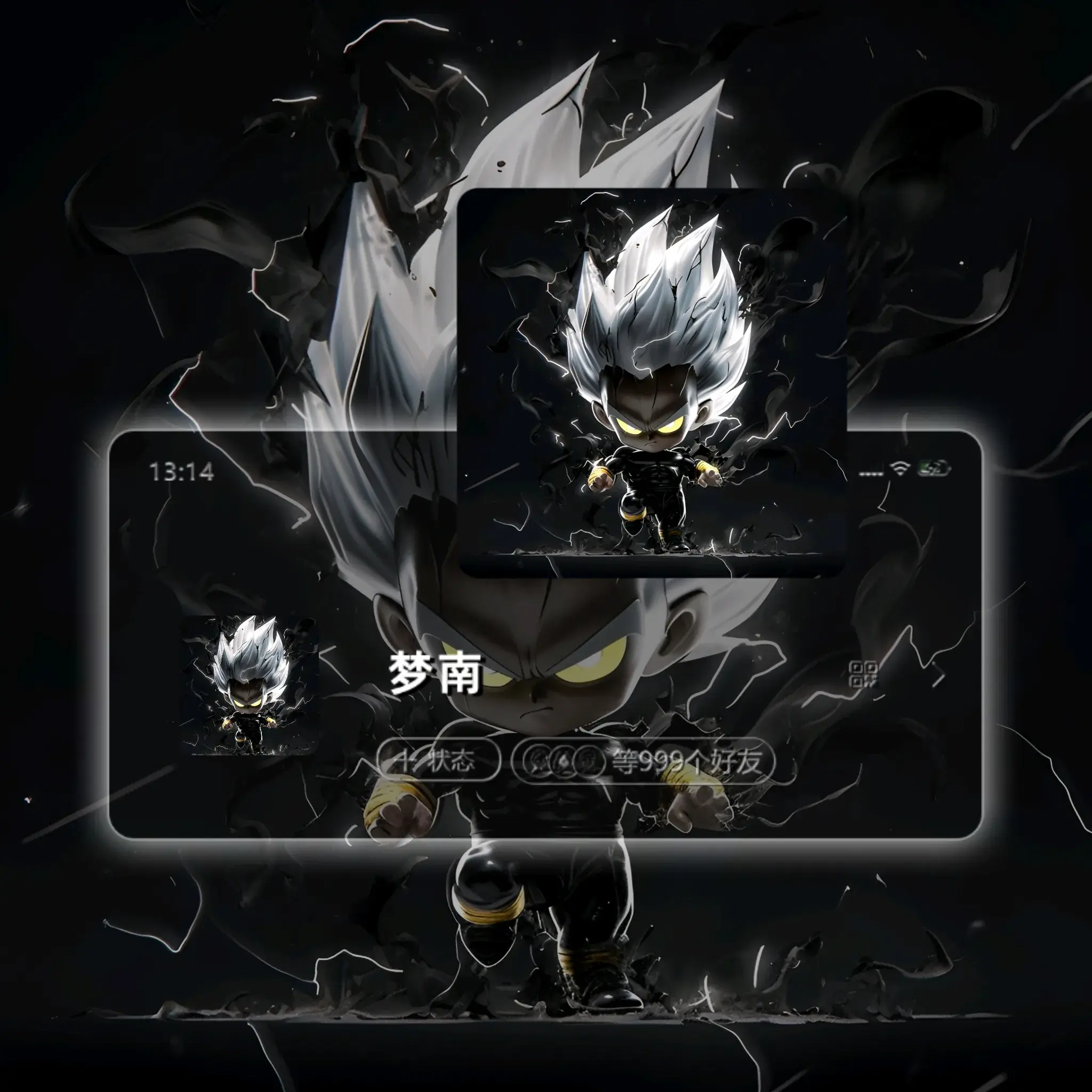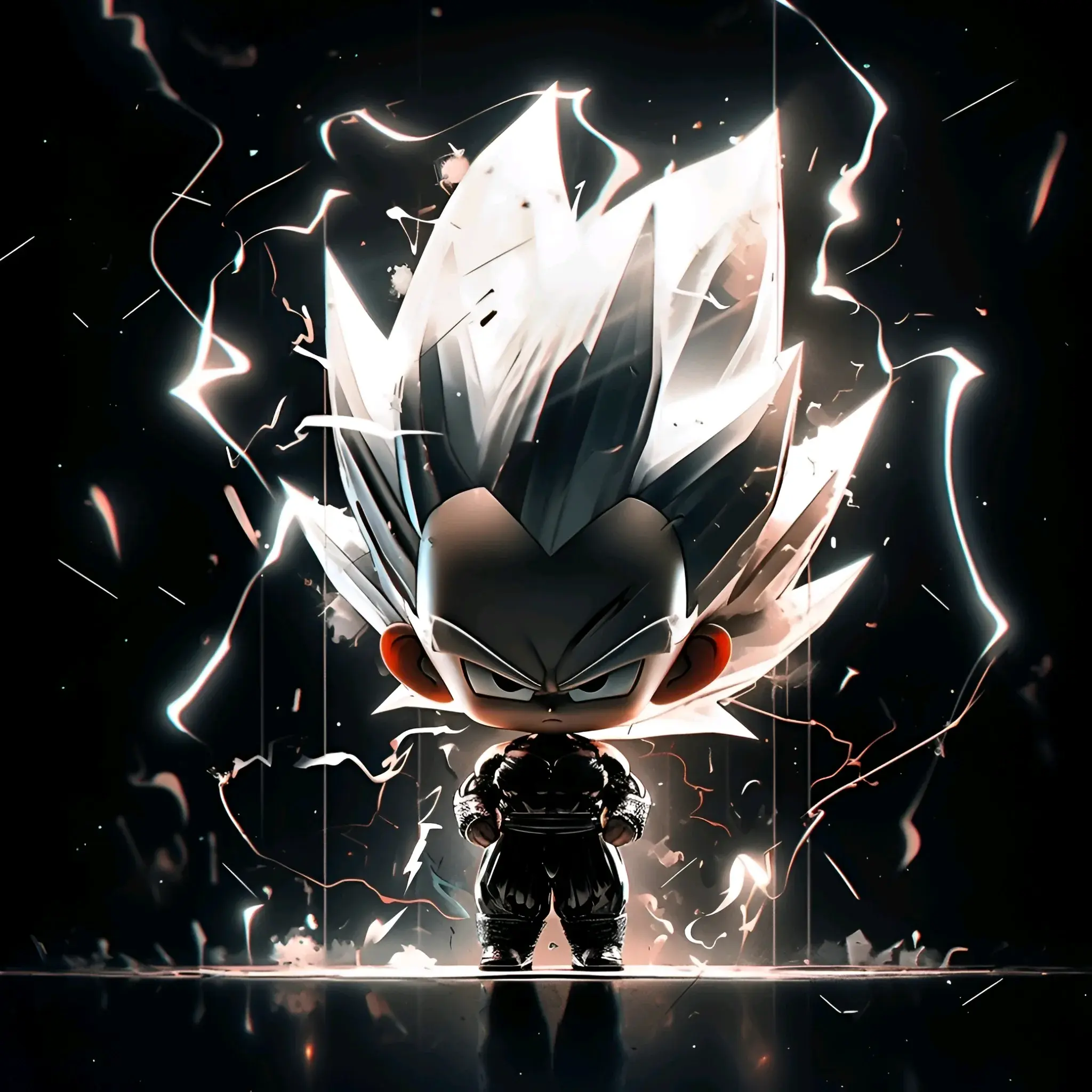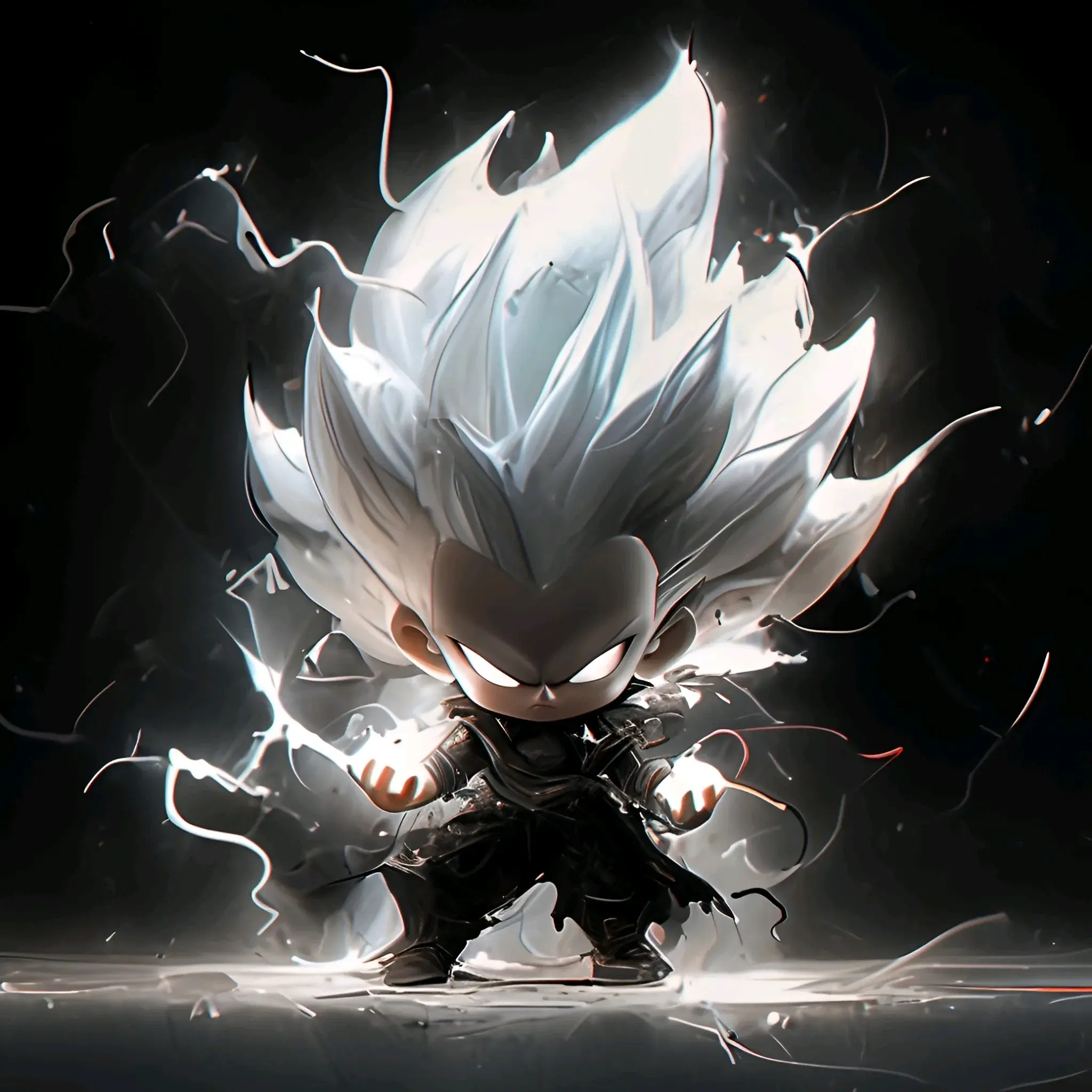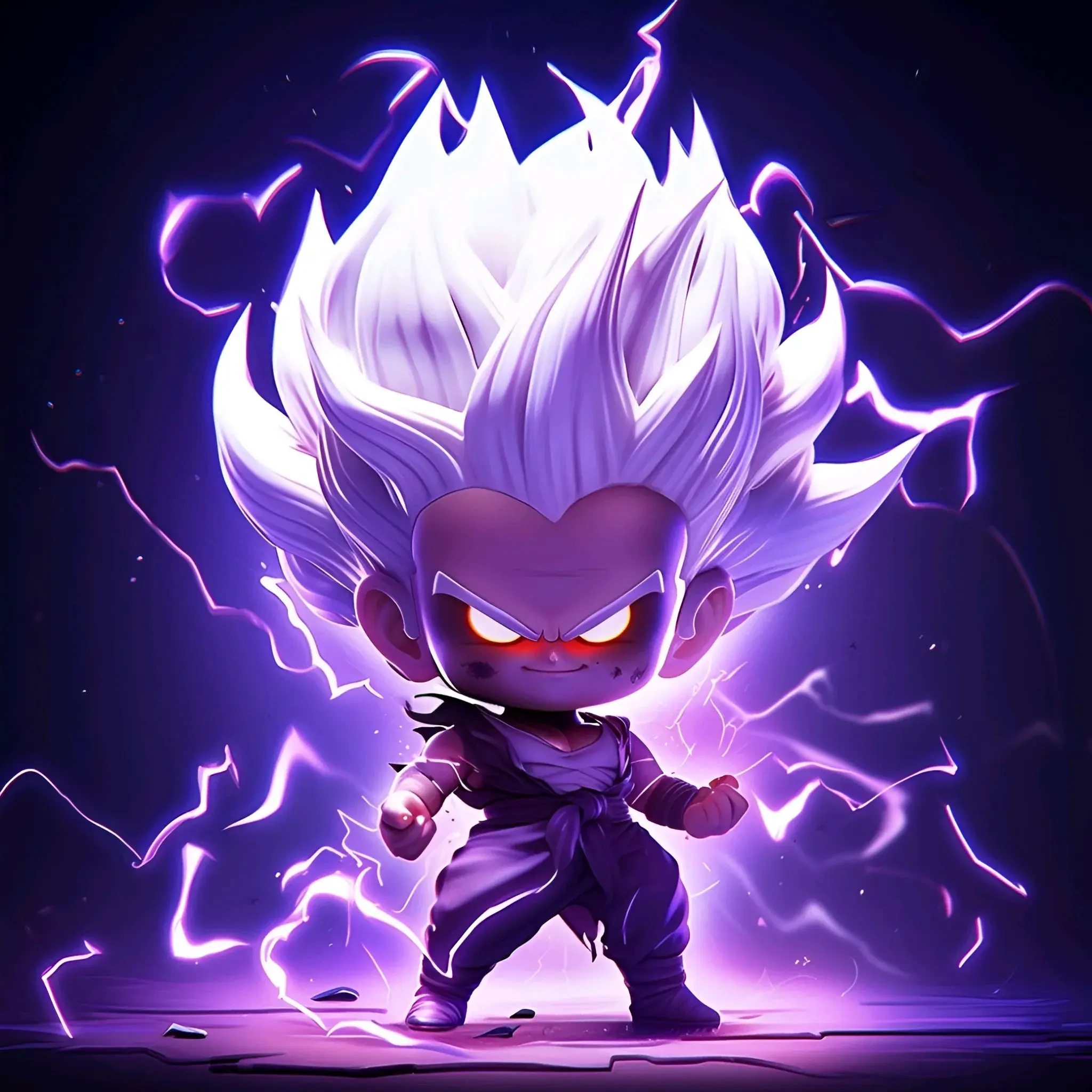 在一个黑暗的世界里,有一个超级无敌赛亚人,他的头非常大,是 Q 版的形象,看起来非常可爱。他的白色头发干净整齐,耳朵透明,身上穿着黑色的衣服,闪烁着闪电。
