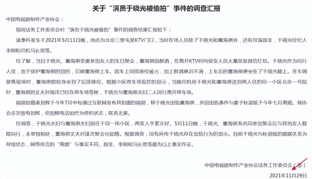 而对于此次事件,中国电视剧制作产业协会官网也进行了调查并公布了结果。经了解,当日于晓光与董海祺受邀参加友人的生日聚会,董海祺因醉酒在离开时向KTV保安人员大量派发红包,于晓光作为同行人员,出于对女方的保护目的,将董海祺召唤上车,而董海祺因为醉酒意识不清,上车后就坐到了于晓光腿上,但是在车辆驾驶离现场时,董海祺很快转身坐到了后排。