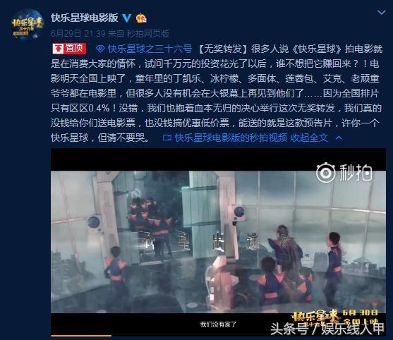“很多人说《快乐星球》拍电影就是在消费大家的情怀,试问千万元的投资花光了以后,谁不想把它赚回来?!电影明天全国上映了,童年里的丁凯乐、冰柠檬、多面体、莲蓉包、艾克、老顽童爷爷都在电影里,但很多人没有机会在大银幕上再见到他们了……因为全国排片只有区区0.4%!没错,我们也抱着血本无归的决心举行这次无奖转发,我们真的没钱给你们送电影票,也没钱搞优惠低价票,能送的就是这款预告片,许你一个快乐星球,但请不要哭。”
