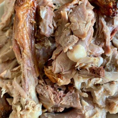 1、烤鸭鸭架拆开,切小块,去除淋巴,鸭尾。
