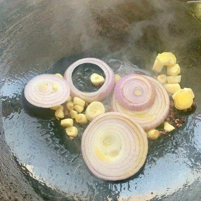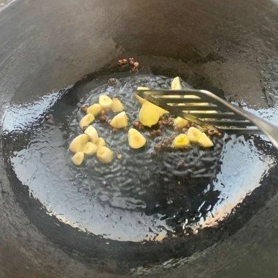 3、热锅凉油,油热下蒜、姜、花椒炸香。