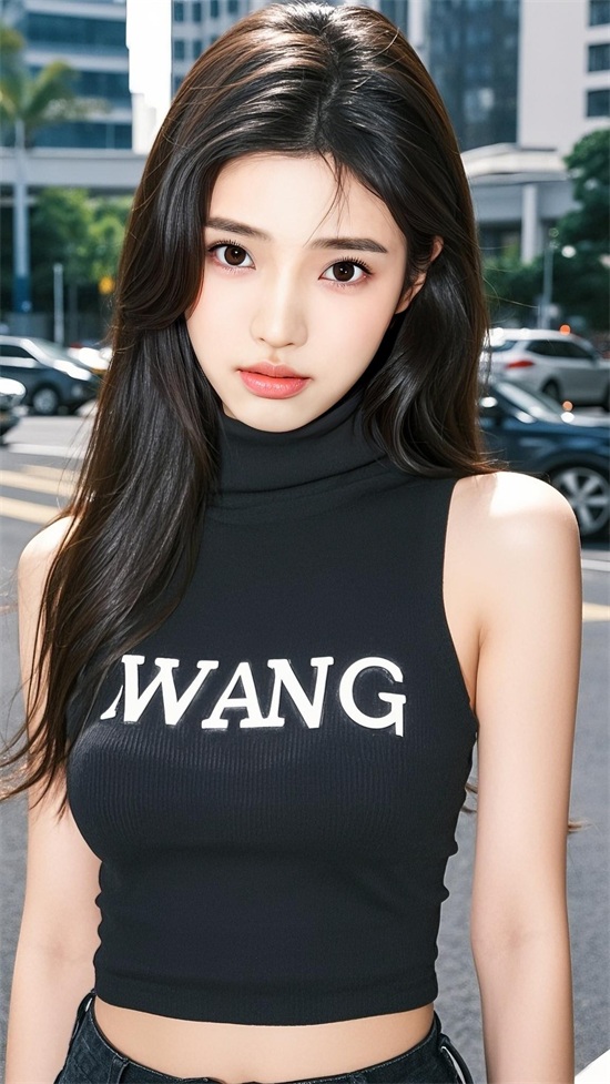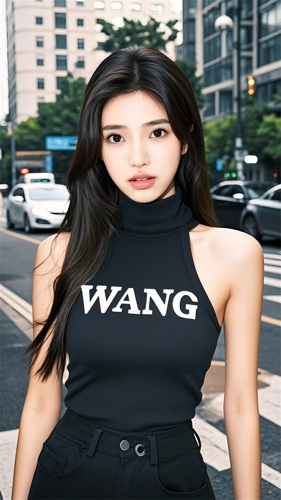 黑色上衣上的大写“WANG”字母图案,简约又极具辨识度,增强了整体造型的时尚感。这种风格带有一丝街头风的元素,仿佛在宣示着她不拘一格的个性与自信。她的长发自然地垂落在肩头,随风微微飘动,增添了一丝随性与洒脱的气息。这种自然的状态,使得她看起来不仅时尚,还非常接地气,让人觉得她并不是那种高高在上的冷美人,而是可以亲近、交谈的都市女孩。
