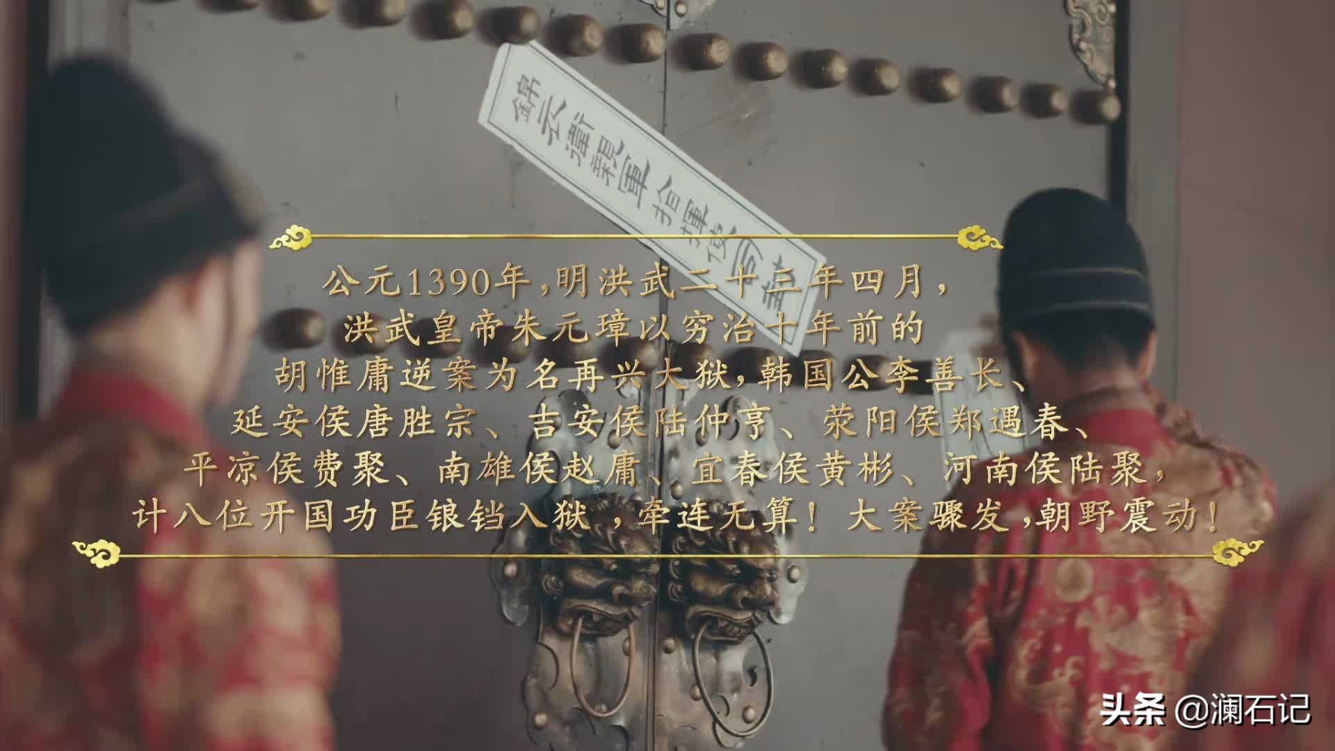 剧中交代,明洪武二十三年四月,朱元璋以穷治十年前的胡惟庸逆案为名再兴大狱,韩国公李善长、延安侯唐胜宗、吉安侯陆仲亨、荥阳侯郑遇春、平凉侯费聚、南雄侯赵庸、宜春侯黄彬、河南侯陆聚,共计八位开国功臣锒铛入狱,牵连无算!