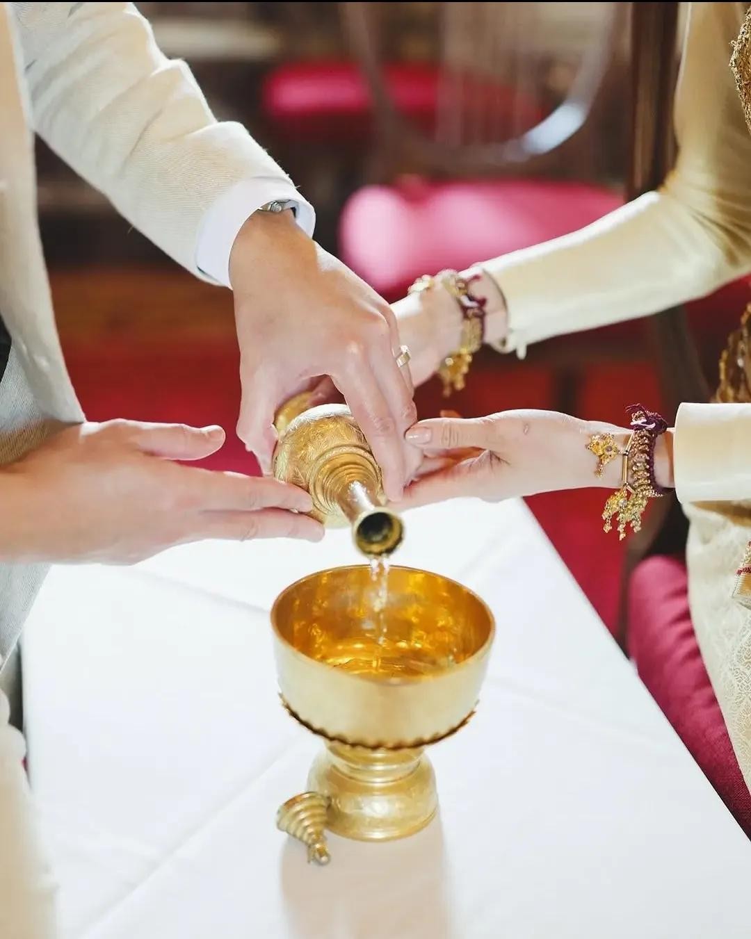 Taew手上戴的求婚大钻戒,也很吸睛。倒圣水的时候,准新郎跟准新娘要两手扶着杯子,一起把圣水倒进去。