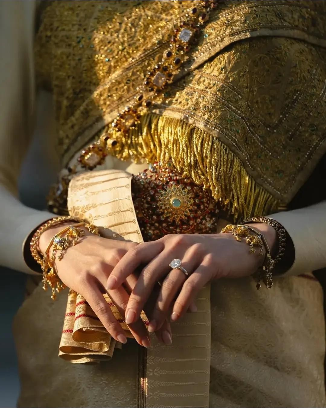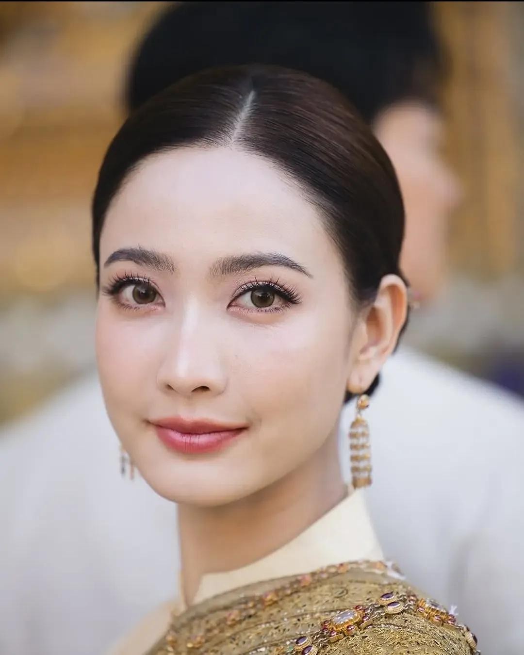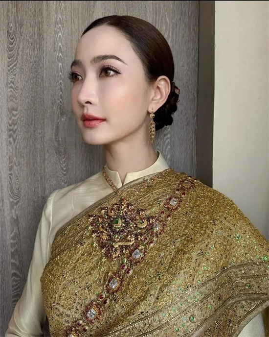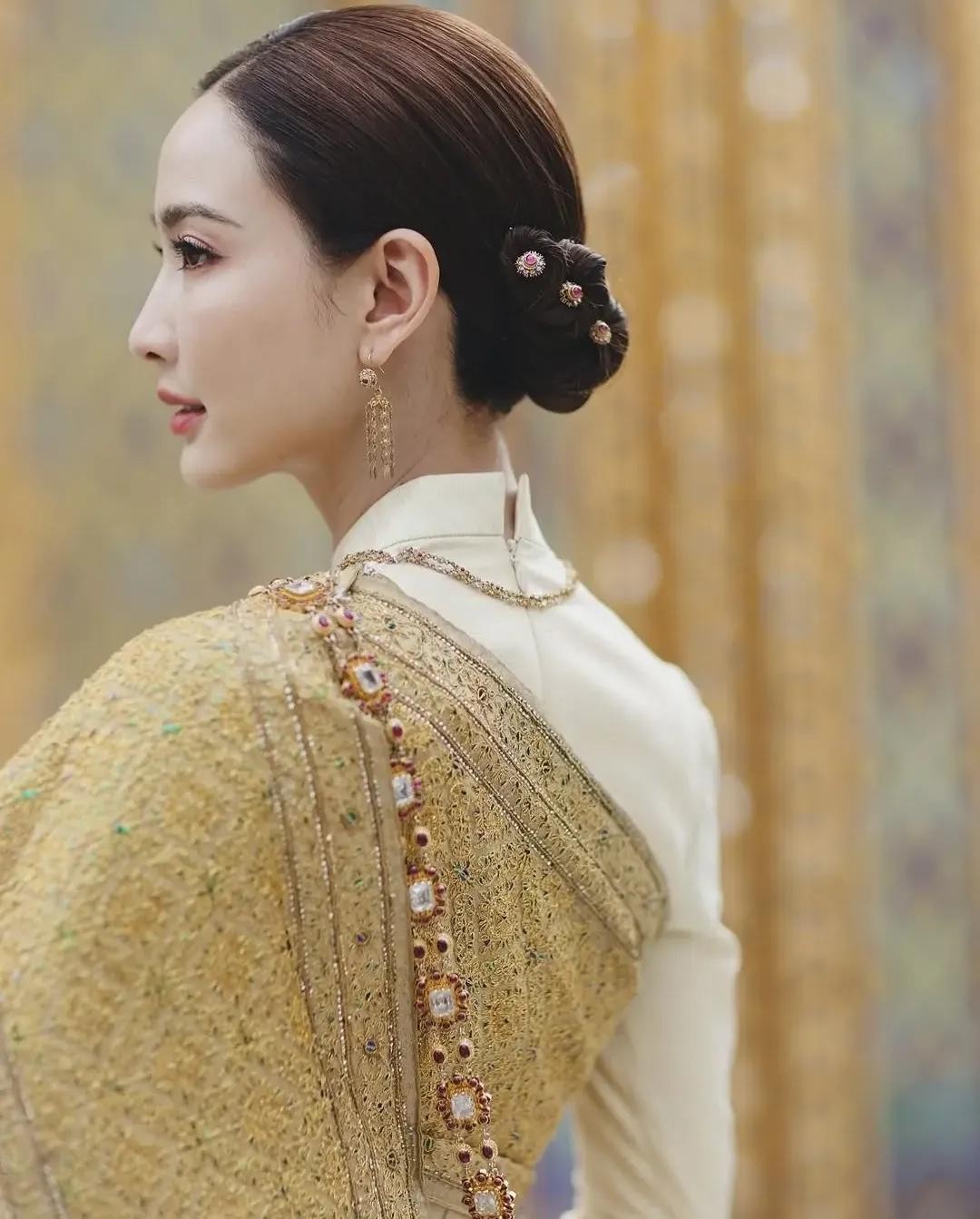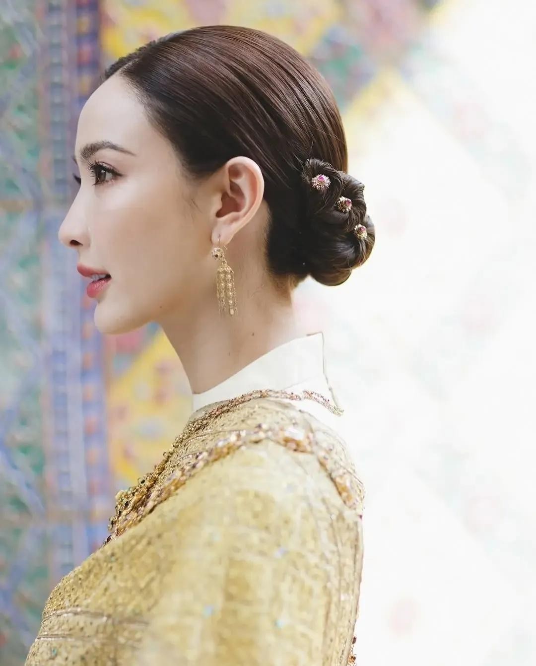 当天,Taew身穿泰国传统服饰,头发挽起来,还插了3个簪子进去,为这个发型多增添一份美感。