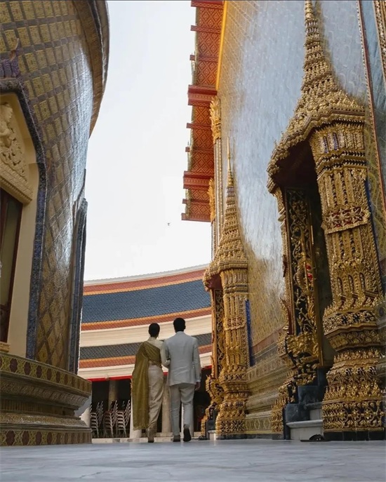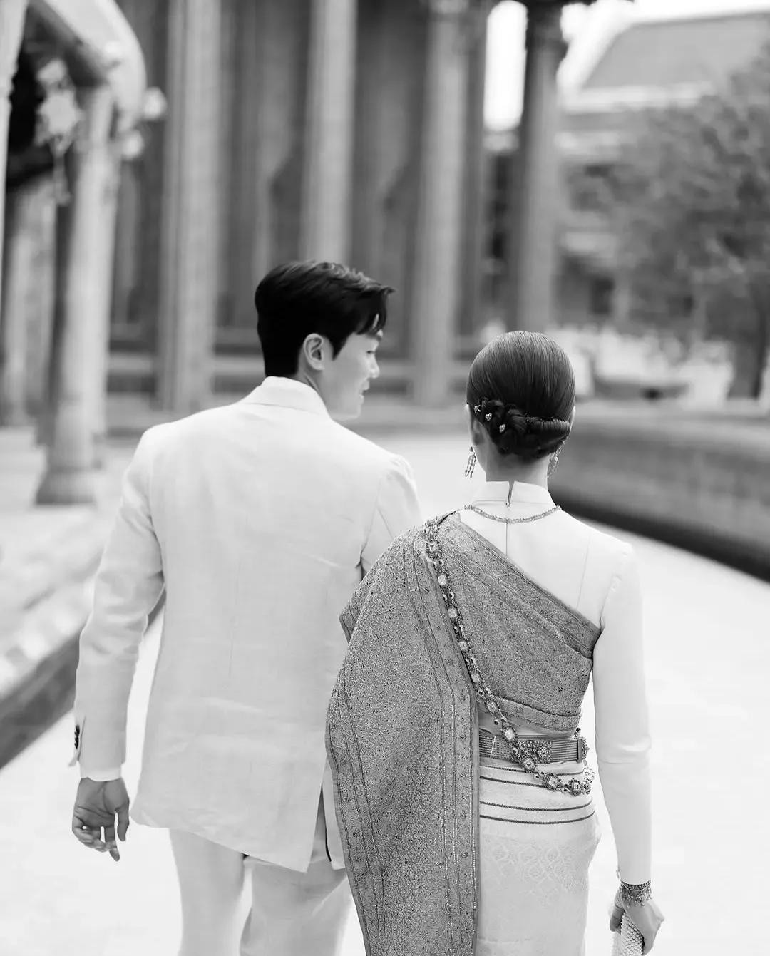 Taew和未婚夫手牵手走的背影,看起来好甜,还有Taew一个人拍摄的背影照,看起来也很美,把她背部的线条曲线拍摄出来。