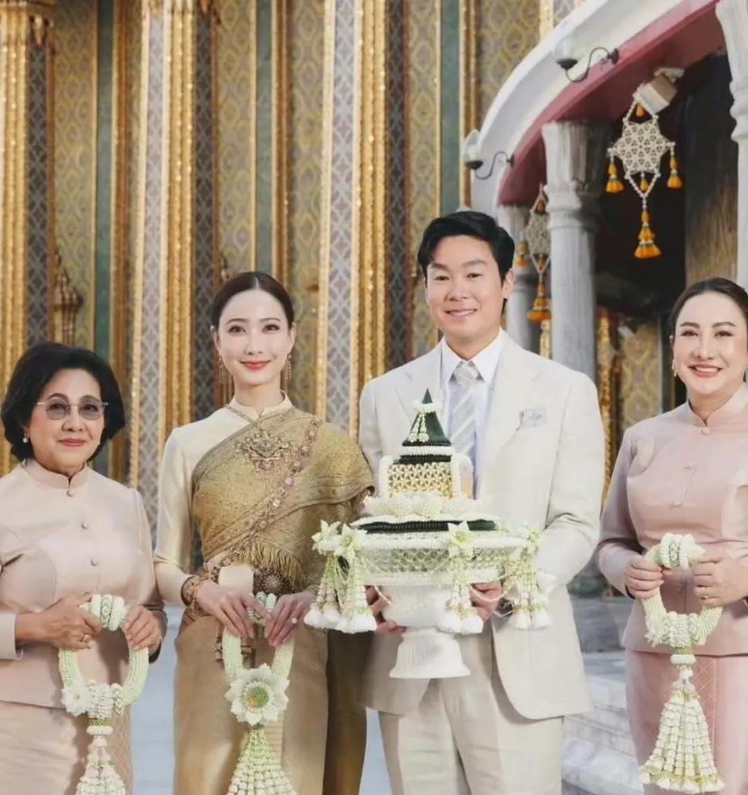 5位女士手里都拿有一串花环,准新郎两手捧着一个应该是赐福要用的东西。Taew和未婚夫Pranai站在一起合影了几张照片,有一张是和Taew的妈妈以及姐姐合影的。