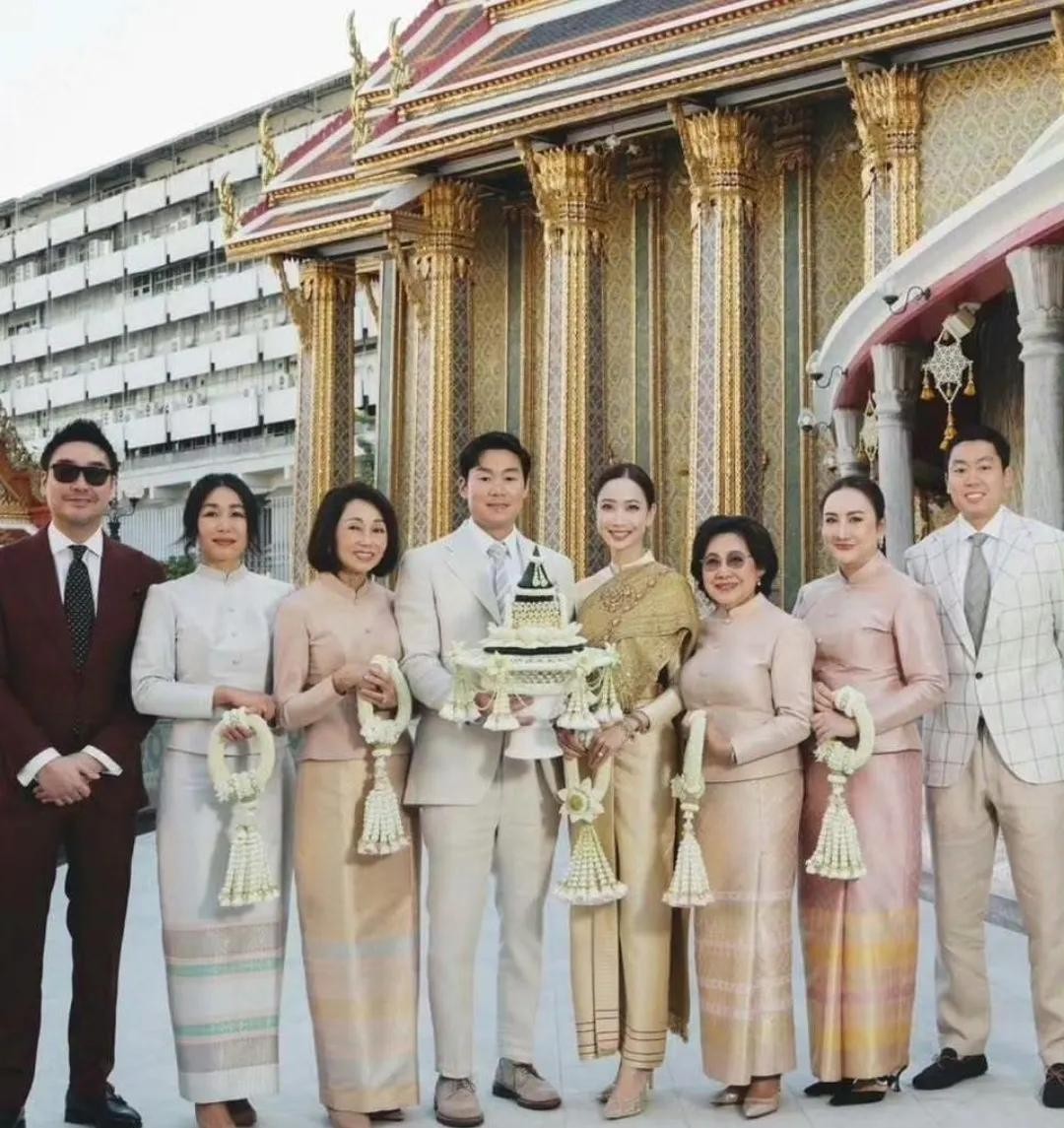 准新娘和准新郎在双方亲人陪同下一起去寺庙举行赐福仪式,那张大合影里有8个人,戴眼镜的是Taew的妈妈,过去的是Taew姐姐,姐姐旁边应该是姐夫。而另外一边是男方的亲人,有Pranai的妈妈,妈妈过去那个应该是Pranai的妹妹,再过去的是哥哥。