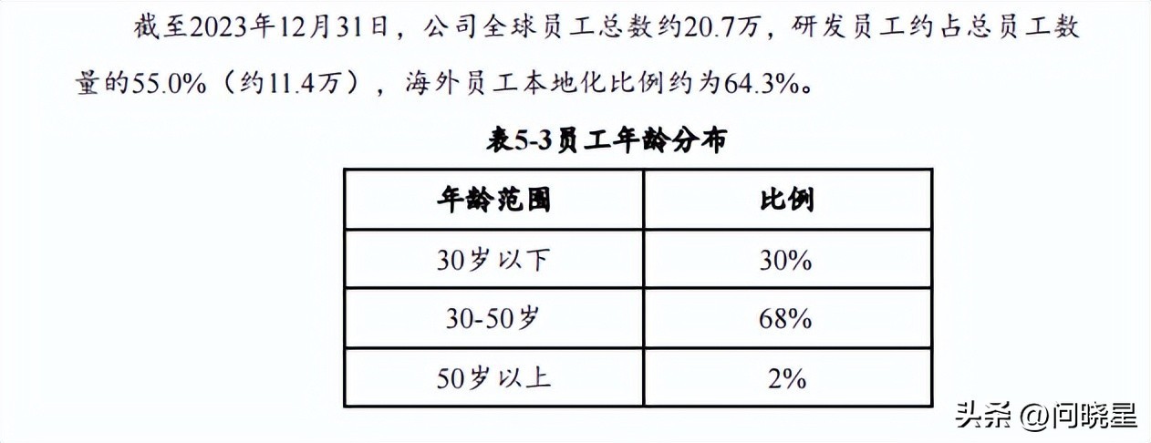 华为全球员工总数20.7万,研发员工占55%,高管入职最少24年