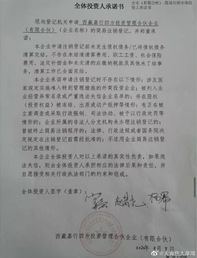 证据七(图8):工作室注销投资人承诺书,曾嘉、赵若尧、杨幂三人承诺,该公司已将债务结清!西藏嘉行是股转协议中担责的三家有限合伙之一,另外两家也已注销。”