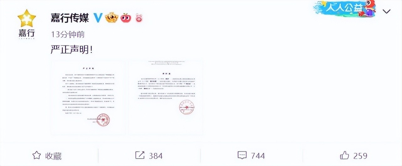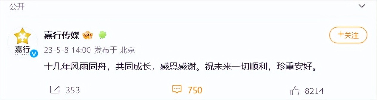 同时,嘉行传媒官博也发文写道:“十几年风雨同舟,共同成长,感恩感谢。祝未来一切顺利,珍重安好。”
