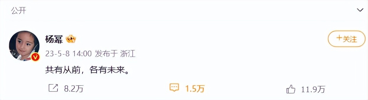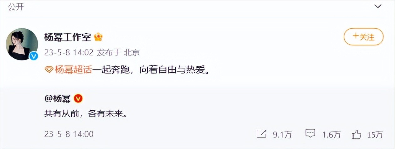 5月8日,杨幂发微博官宣与嘉行传媒结束合作关系。