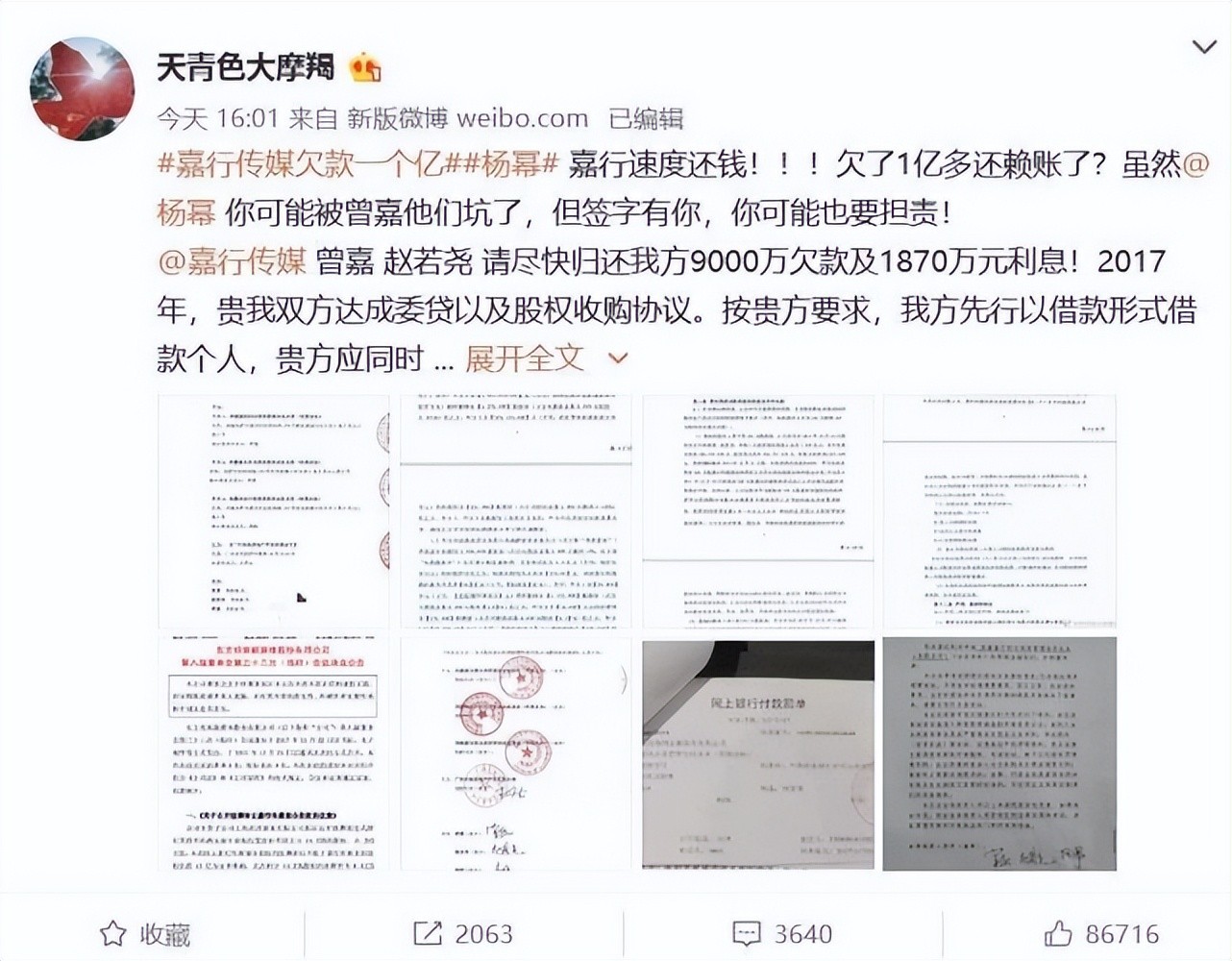 “#嘉行传媒欠款一个亿##杨幂# 嘉行速度还钱!!!欠了1亿多还赖账了?虽然@杨幂 你可能被曾嘉他们坑了,但签字有你,你可能也要担责!