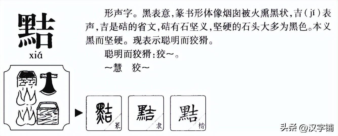 “黠”,初见于秦代小籇中,形声字,“黠”字简体版的楷书从秦朝小篆演变而来。“黠”的字源演变图如下: