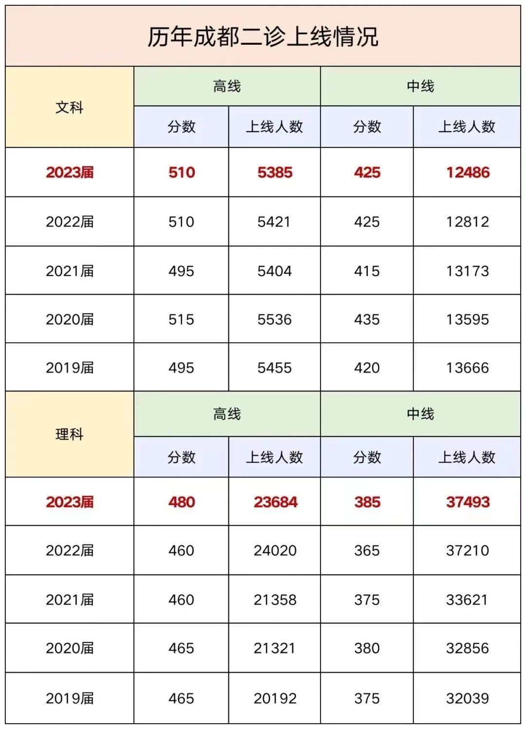 二诊的成绩往往比较接近高考成绩,大多数人会将二诊的成绩作为高考分数的参考。所以往年的分数线也有一定的参考价值,下面我们汇总了2019-2023年成都二诊分数线以及上线率,一起来看看: