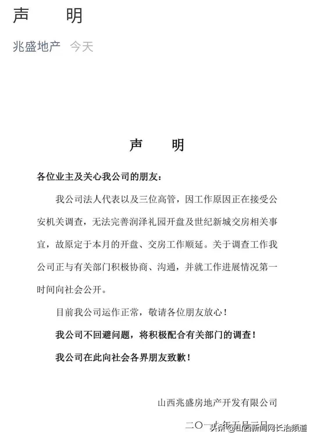 昨日(5月3日),兆盛地产就“因法人陈兆平等人接受公安机关调查,无法完善润泽礼园(欧亚小镇)开盘及世纪新城交房相关事宜”发布声明!