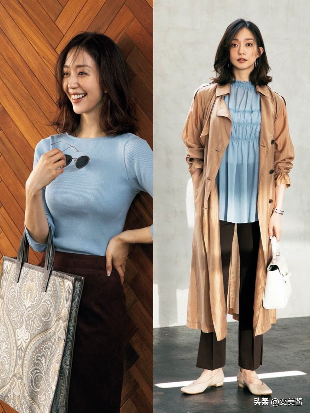 浅蓝色与焦糖色有相似之处,都属于那种比较干净清爽的颜色,能够作为很不错的提亮色。利用浅蓝色来搭配焦糖色也特别的好看,上身选择一款浅蓝色的针织打底衫,衬肤的同时,又能够凸显清新知性气质,下身搭配焦糖色的下装,彰显知性而又沉稳的气质。右图的搭配也很好看,外搭选择的是经典款式的卡其色风衣外套,内搭薄荷绿色的雪纺上衣,下身再搭配一条焦糖色的西装裤,既能够穿出沉稳大气感,又能够打造出亮点,穿出清爽又时尚的感觉。