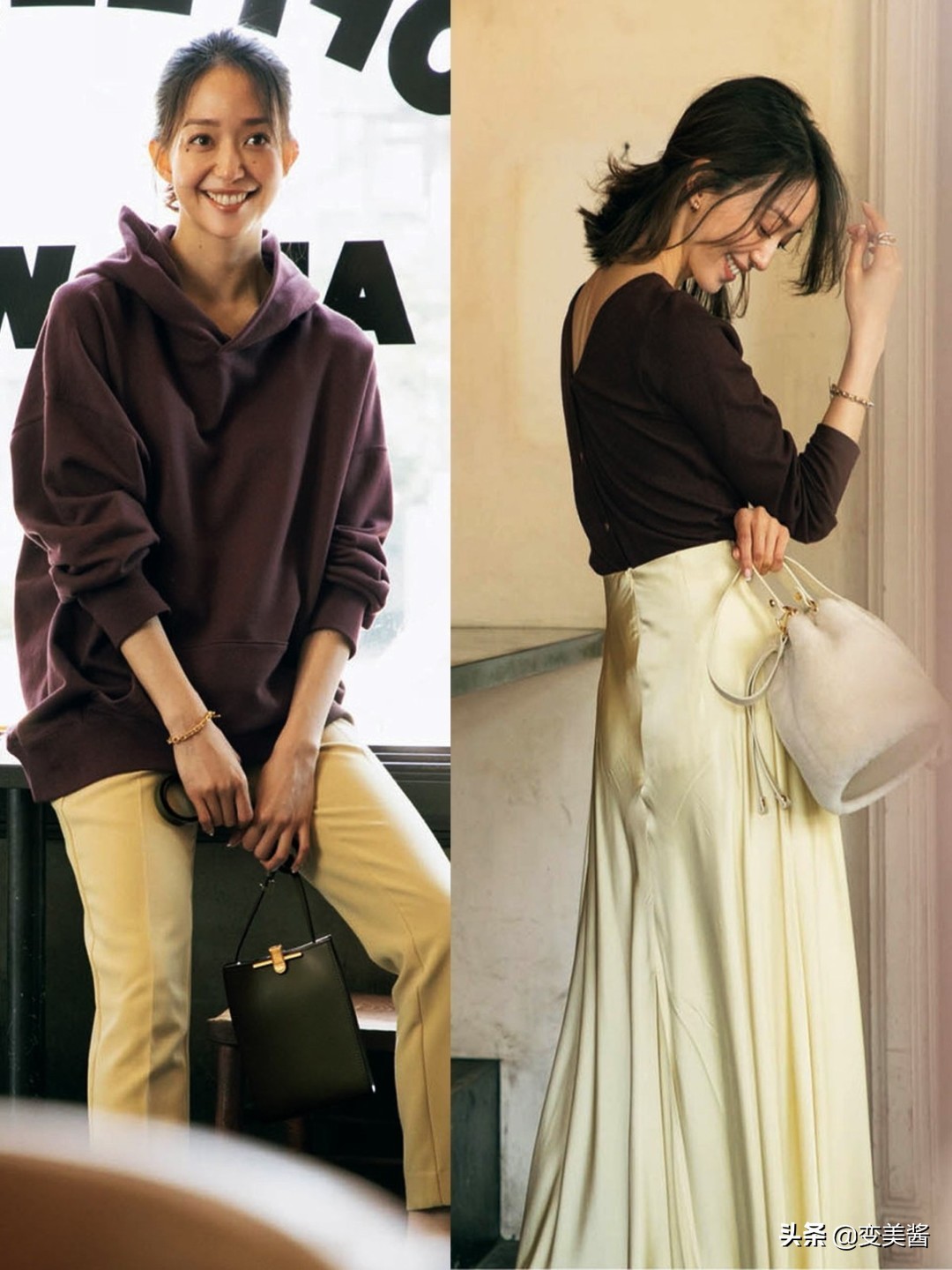 焦糖色与淡黄色同为大地色系,所以两者搭配组合在一起总会让人觉得特别的协调,焦糖色因为淡黄色而变得光彩,淡黄色也因为有焦糖色而变得沉稳。选择一款焦糖色的卫衣,穿上身显得随性又舒适,下身再搭配一条淡黄色的西装裤,能够很好的提亮暗色系的上衣,多了几分清新又抢眼的感觉。右图的穿搭也特别好看,上身选择的是一款焦糖色的针织打底衫,温柔知性,背后V领的设计,减弱沉闷的感觉,又能够穿出几分小性感,下身再搭配一条绸缎质地的淡黄色高腰半身长裙,温柔吸睛,同时又能够彰显高级质感。