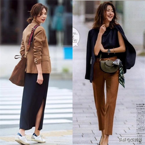 焦糖色,虽说不够张扬,但它足够醒目,所以它是一个极具包容性的颜色,不管是搭配浅色系还是暗色系都很协调。如果说你想要穿得低调沉稳一些,就可以考虑利用黑色来搭配焦糖色。参考这两组搭配,在左图的搭配中,外搭选择的是一款焦糖色的羊绒西装外套,看起来很有质感,穿上身显得高级又气质,内搭了一条黑色的连衣长裙,高开叉的设计能够打破沉闷厚重的感觉,更显得轻盈飘逸,整套穿搭呈现给人的感觉知性沉稳又不失高级范。利用黑色西装外套搭配焦糖色的西装裤也特别有品位,焦糖色既能够减弱黑色上衣带来的沉闷感,又能够彰显高级质感。