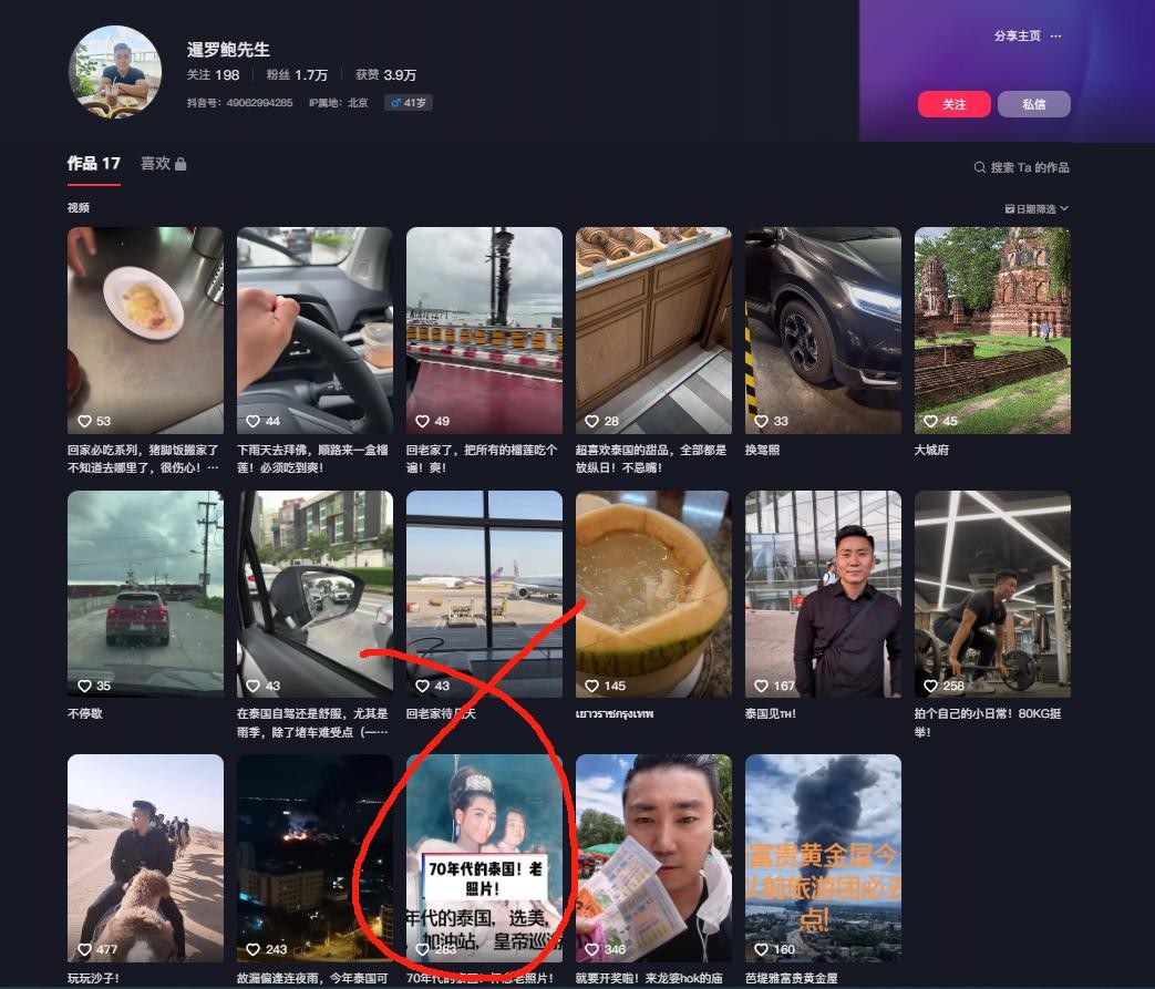 网上有一个长相和鲍玺非常相似抖音作者,看年龄和内容,特别是有一条抖音内容“70年代的泰国,怀念老照片”,不得不让人联想到,他和泰国“人妖皇后”妮莎的故事。