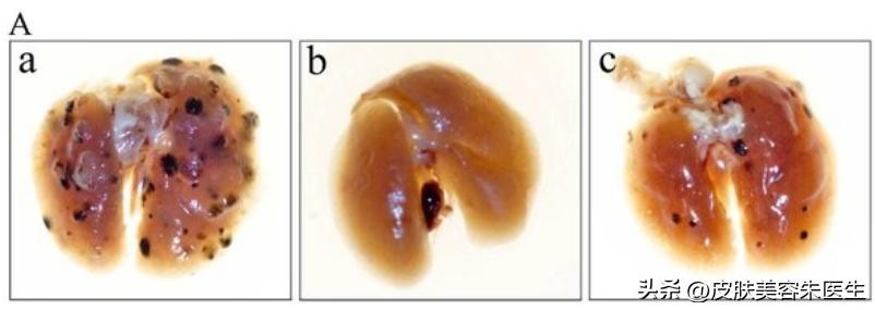 照片1:这是患黑色素瘤的老鼠的肺,你可以看到上面的黑点是转移性黑色素瘤细胞。